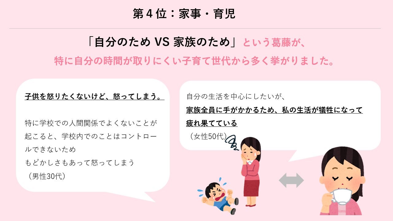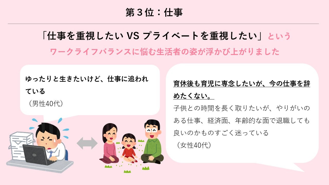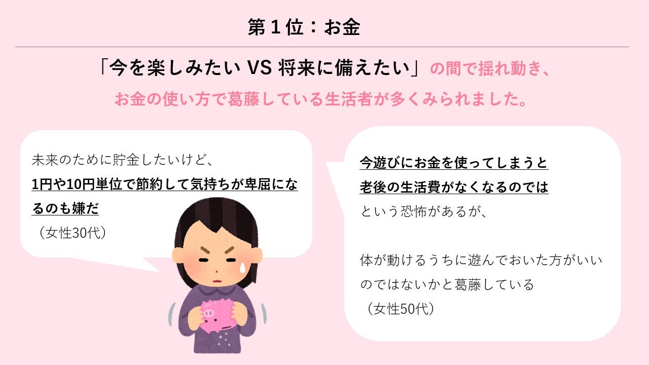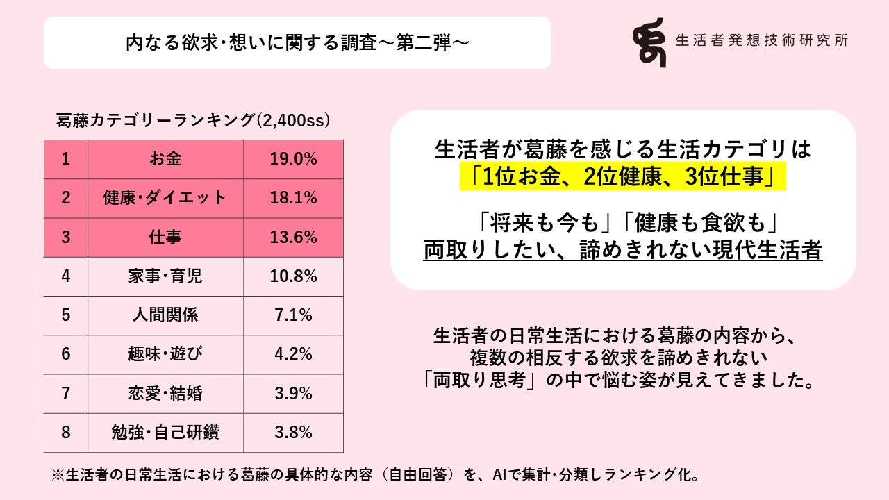 生活者が葛藤を感じる生活カテゴリは「1位お金、2位健康、3位仕事」。