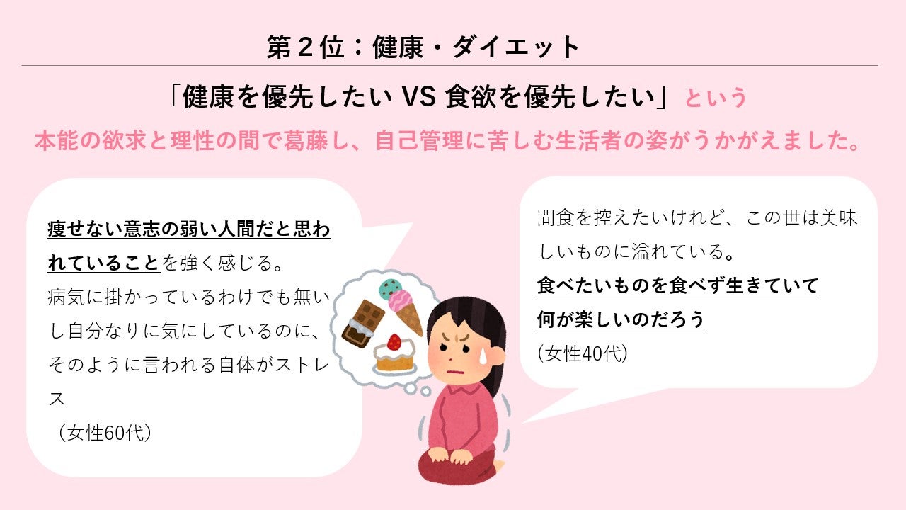健康や美容を気にしつつも食を諦めきれずにいる自分への生々しい葛藤が多く挙がりました。特に体型の維持は自己肯定感とも強く結びついており、度重なる葛藤のすえ「食は生きる楽しみなのだから何が悪い」という思いに至ったという声もあがりました。
