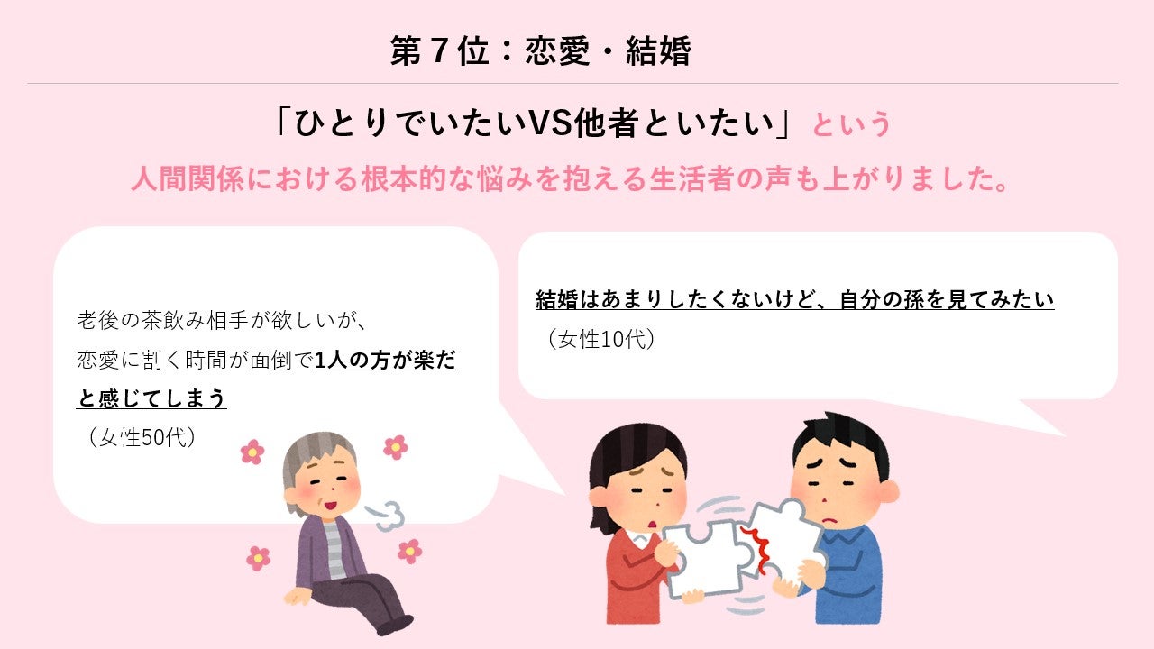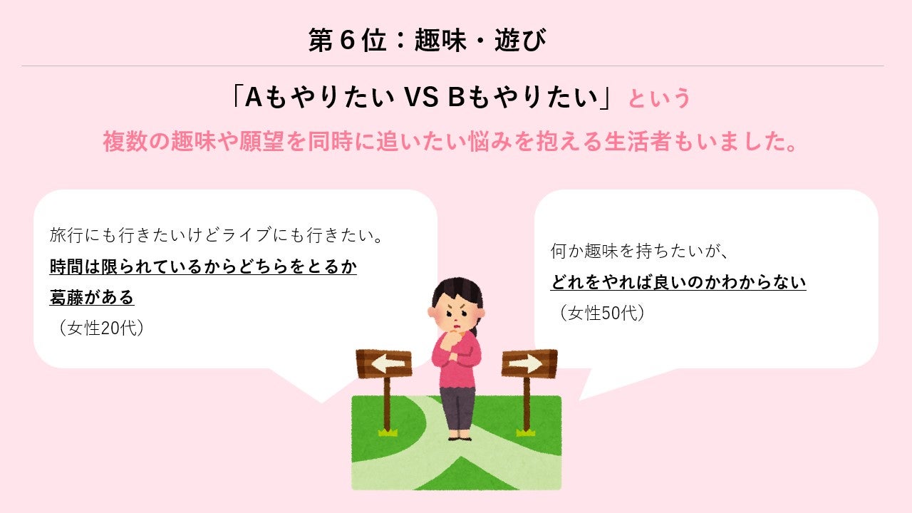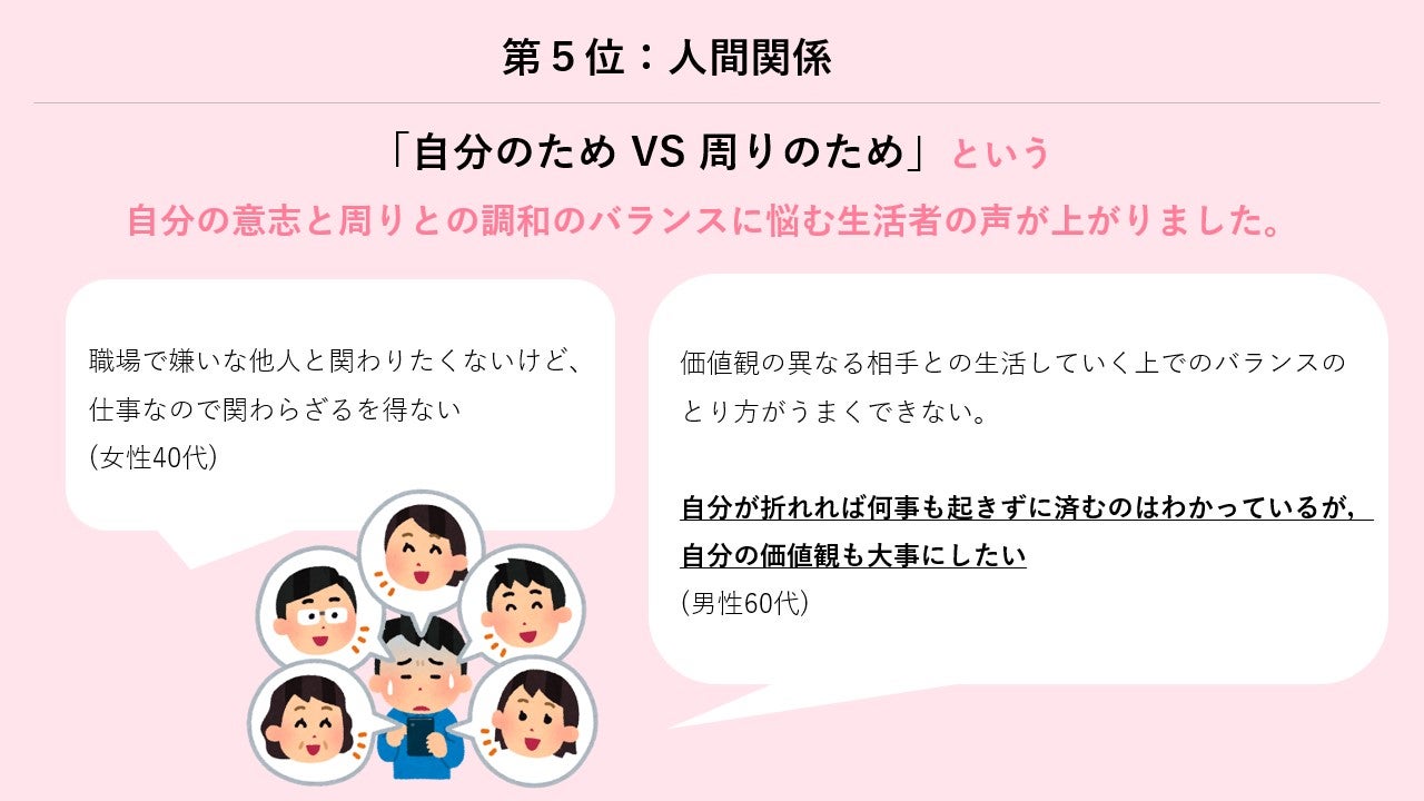 今回のリリースでは自由回答を分析し、現代を生きる生活者が抱える葛藤の具体的な「生声」について見てきました。自由回答の分類による現代の葛藤TOP3は「お金・健康・仕事」となりましたが、その中身を詳しく見ていくと、私たちの生活では「将来vs現在」「健康vs食欲」「仕事vsプライベート」というような形で取捨選択を迫られる場面が非常に多く、どのように優先順位をつけていくのかという揺らぎを抱えていることがわかります。自由回答ではまだ直面していない未来に対する不安も多く見られ、自由化が進む社会の中で選択肢が膨大に増えたこと、またデジタル技術の発達に伴い、あらゆる選択肢が「見えすぎる」ようになってしまったゆえに、「選ばなかった先の未来」や「他人のアドバイス」も見えすぎ、どちらかを捨てることの恐怖心も大きくなっているようにも読み取れます。