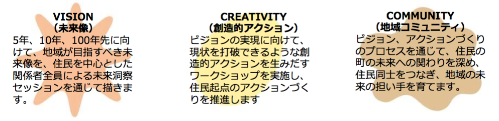 過去3年間のプログラムを通じて、地域が10年程度の中長期的なスパンで活性化し、未来を切り拓いていくためには、必要なポイントが3つあることが明らかになってきました。