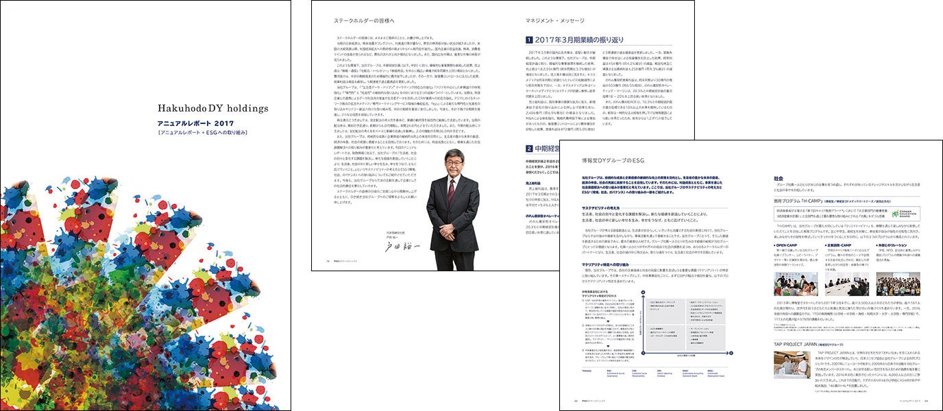 当社グループは、「アニュアルレポート 2017 [アニュアルレポート+ESGへの取り組み]」と、「新しい幸せをつくろう! ソーシャルアクション・ブック 2017」を、博報堂DYホールディングスのHPで公開しました。