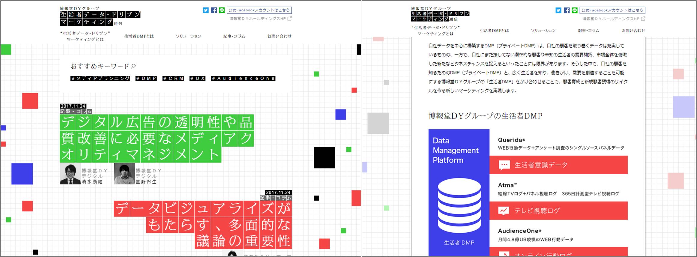 ・サイトコンテンツ:“生活者データ・ドリブン”マーケティングの概要、生活者DMPの概要、博報堂DYグループが提供するソリューション紹介、博報堂DYグループ社員によるコラム 等