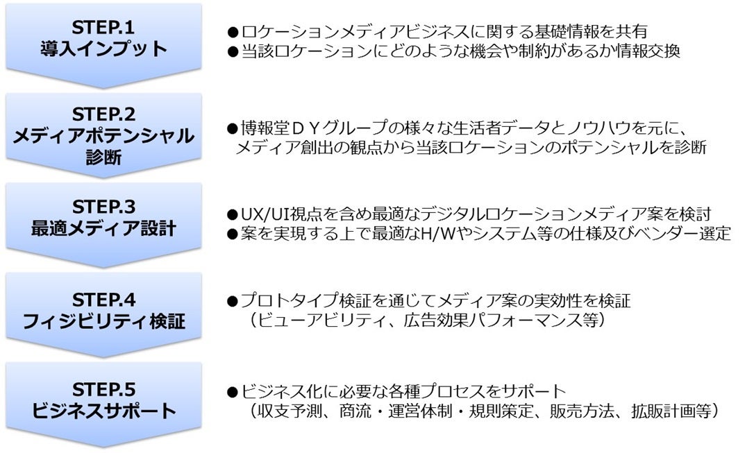 「Space Booster™」は、交通機関や商業施設・店舗などのロケーションオーナーや、そこで既に看板やポスターなどのメディアを運営している企業(メディアオーナー)向けに、「デジタルロケーションメディア」の開発・導入を支援する博報堂DYグループ独自のプログラムです。生活者と企業、双方の視点から当該ロケーションの潜在的な価値を再発見し、そのロケーションに最適かつ高付加価値なメディアの開発・導入をワンストップで支援します。具体的なワークフローは、下記の通りです(※3)。