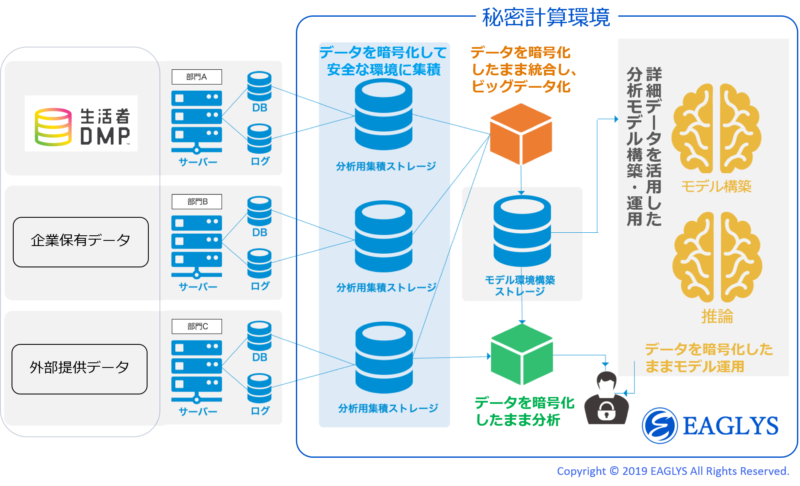 EAGLYSは、企業が部門・組織を超えてデータ資産をセキュアに積極活用できることを目指し、秘密計算技術をコアに、研究開発と社会実装を進めています。特に、ハイパフォーマンスな秘密計算、AI・データマイニング技術とを融合させたSecureAI™️(データを暗号化したまま学習、推論、分析を行う技術)の研究開発、および活用されるデータのセキュアな蓄積、統合、分析ができるプラットフォームの開発、提供を行っています。