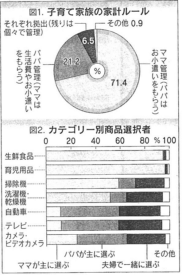 子育て家族の家計管理は、7割以上の世帯でママが握っているとみられる。今回の調査のカテゴリー別商品選択者をみると、ママが主に選んでいるのは生鮮食品で95.0%、育児用品で95.6%となり、掃除機(58.7%)なども高かった。(図1)(図2)
