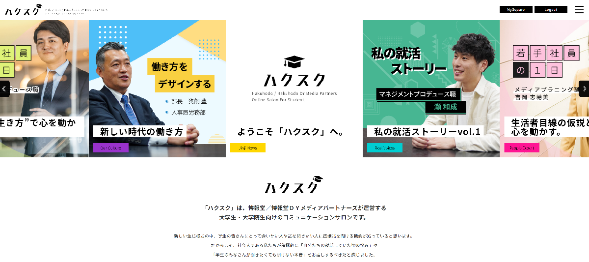 株式会社博報堂(本社:東京都港区、代表取締役社長:水島正幸)、株式会社博報堂DYメディアパートナーズ(本社:東京都港区、代表取締役社長:矢嶋弘毅)<以下、両社を合わせて「当社」>は、キャリアを考える学生に向けたコミュニケーションサロンサイト「ハクスク」を2020年12月2日に開設いたしました。