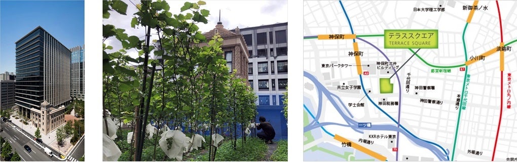 15年5月に開業した地上17階地下2階建の商業施設・カンファレンスホール・オフィスからなる複合施設「テラススクエア」の地上13メートル、広さ50平方メートルの屋上農園。赤ワイン用のブドウ品種ピノ・ノワールを30本植えています。