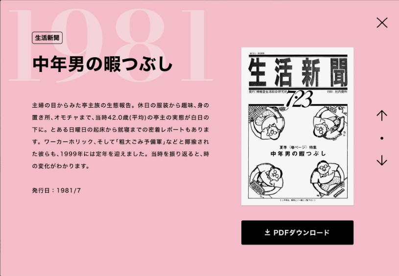 本特設サイトでは過去に発行した研究レポート「生活新聞」「生活者」の名作選・約200号に加えて、「みらい博」をはじめとする年に一度の社会提言、「シルバー30年変化」といった時系列テーマ調査など、40年間の研究成果を一覧いただけます。