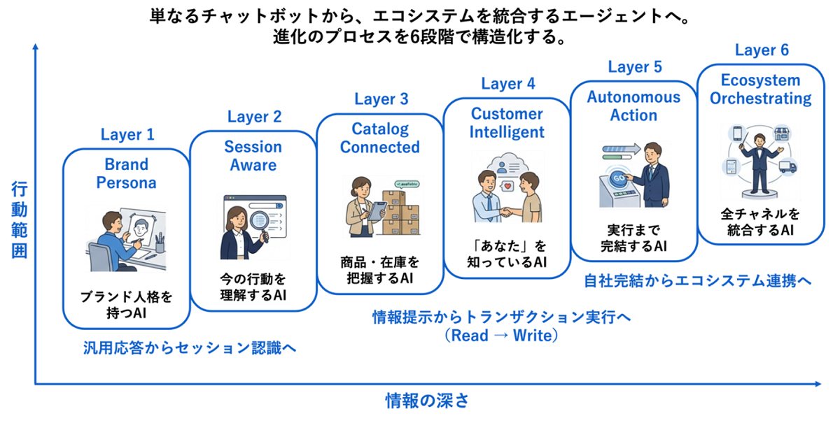 このモデルを起点に、企業が「今どのレイヤーにいるか」「次にどこを目指すか」を明確にした上で、目標レイヤーへの到達に向けた構築・運用を段階的に支援します。ブランドの人格設計(Layer 1)から始め、在庫・顧客データとの連携(Layer 3~4)、購買の自律実行(Layer 5)、全チャネル統合(Layer 6)へと、企業の状況に応じたペースで進化させていきます。