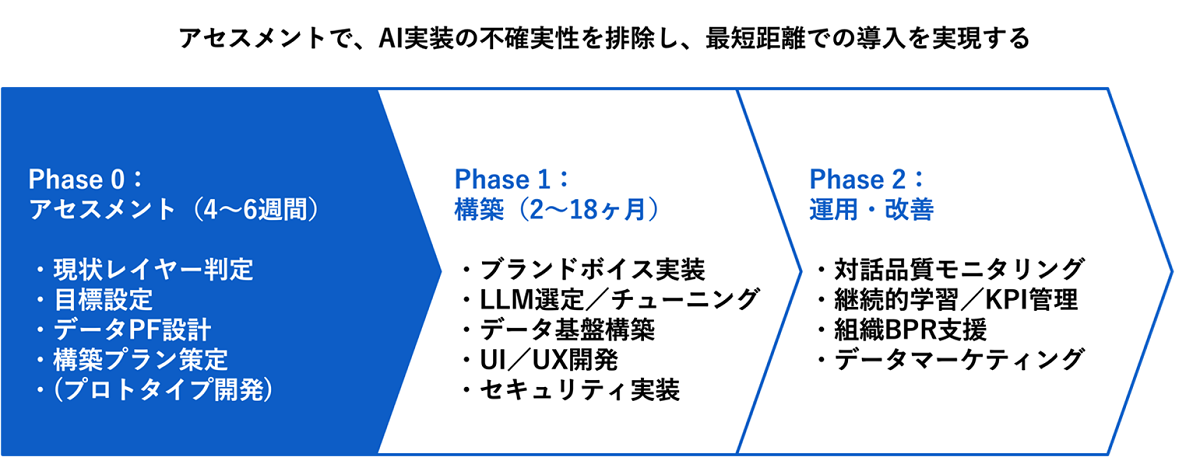 本サービスは、まず4~6週間のアセスメントフェーズ(Phase 0)でブランドCX起点でのAIエージェントの目標像を定義し、実現に向けた段階的な構築プランと費用対効果を策定します。その後、同プランに基づき、AIエージェントの設計・開発から、品質モニタリング・継続学習・KPI管理・対話データを活用した顧客インサイトの発掘まで、プロジェクト全体を一貫して伴走します。