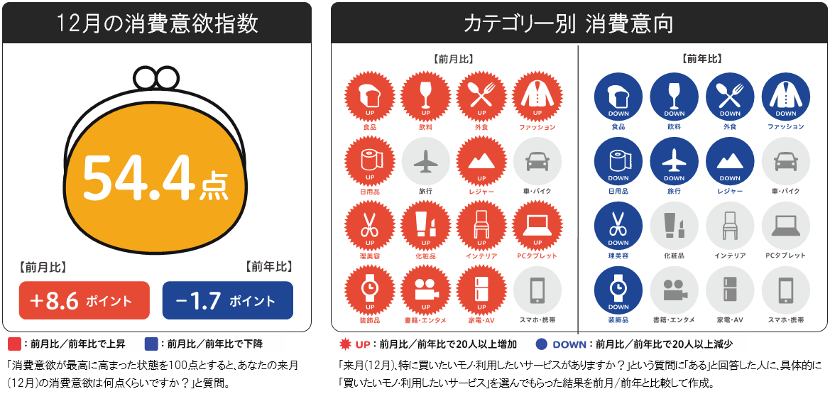12月らしく、多くのカテゴリーで消費意向は高まりますが、例年ほどの水準にはならないようです。
