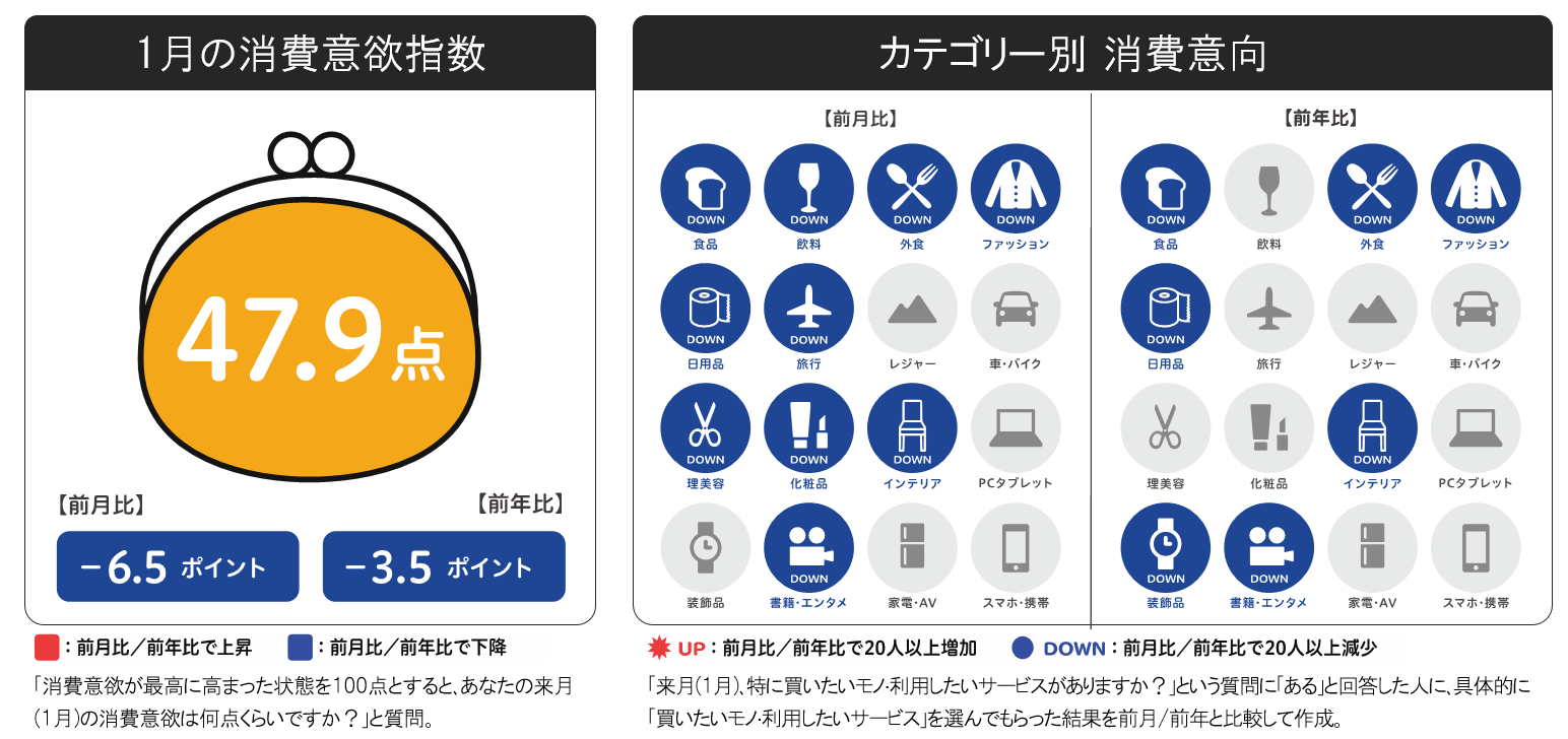 2023年1月の消費意欲指数は47.9点。前月比は-6.5pt、前年比では-3.5ptと、いずれも大きく低下しました。