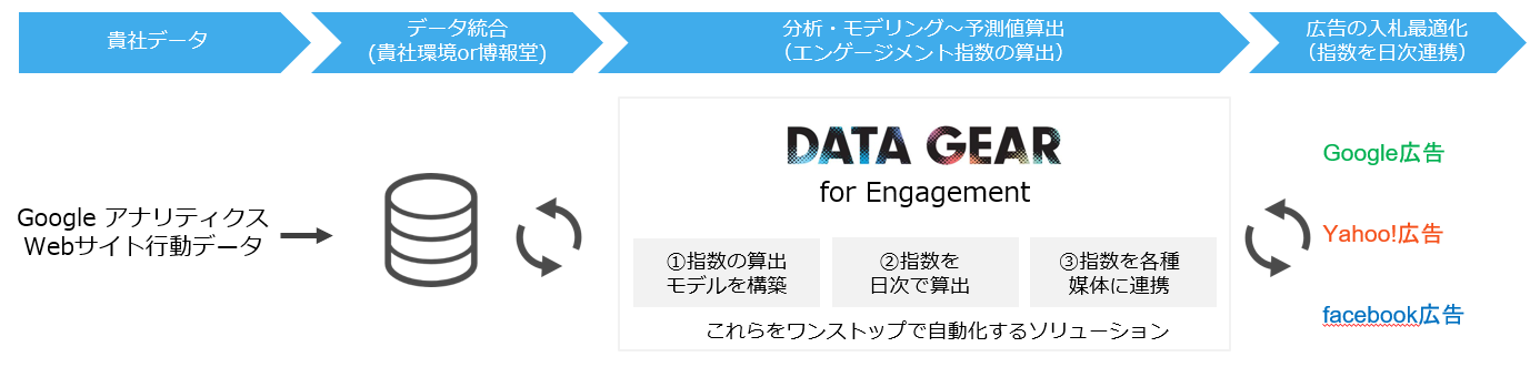 株式会社博報堂、株式会社博報堂DYメディアパートナーズ、デジタル・アドバタイジング・コンソーシアム株式会社の3社横断の戦略組織である「HAKUHODO DX_UNITED」と、株式会社アイレップ(以下アイレップ)は、クライアント企業が保有する顧客ごとの売上/成約データとの連携不要で、デジタル広告のビジネス成果最適化を実現するコンサルティングサービス「DATA GEAR for Engagement」の提供を開始いたしました。これによりダイレクトマーケティングを実施している企業だけではなく顧客ごとの売上/成約データを持ち合わせていない企業でもデジタル施策の高度化が可能となります。