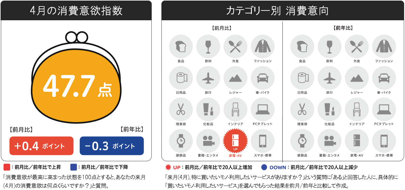 2023年4月の消費意欲指数は47.7点。前月比は+0.4pt、前年比は-0.3ptで、ともに横ばいとなりました。