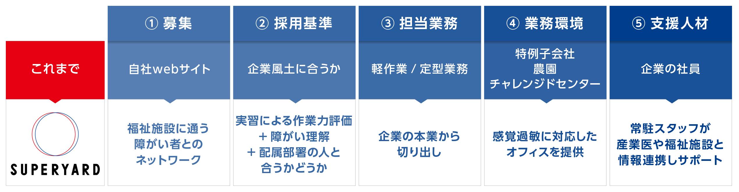 従来の障がい者雇用と以下の 5 つの点を兼ねそろえている点で新しい手法となっています
