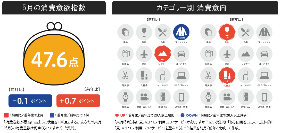2023年5月の消費意欲指数は47.6点。前月比は-0.1pt、前年比では+0.7ptとともに横ばいとなりました。