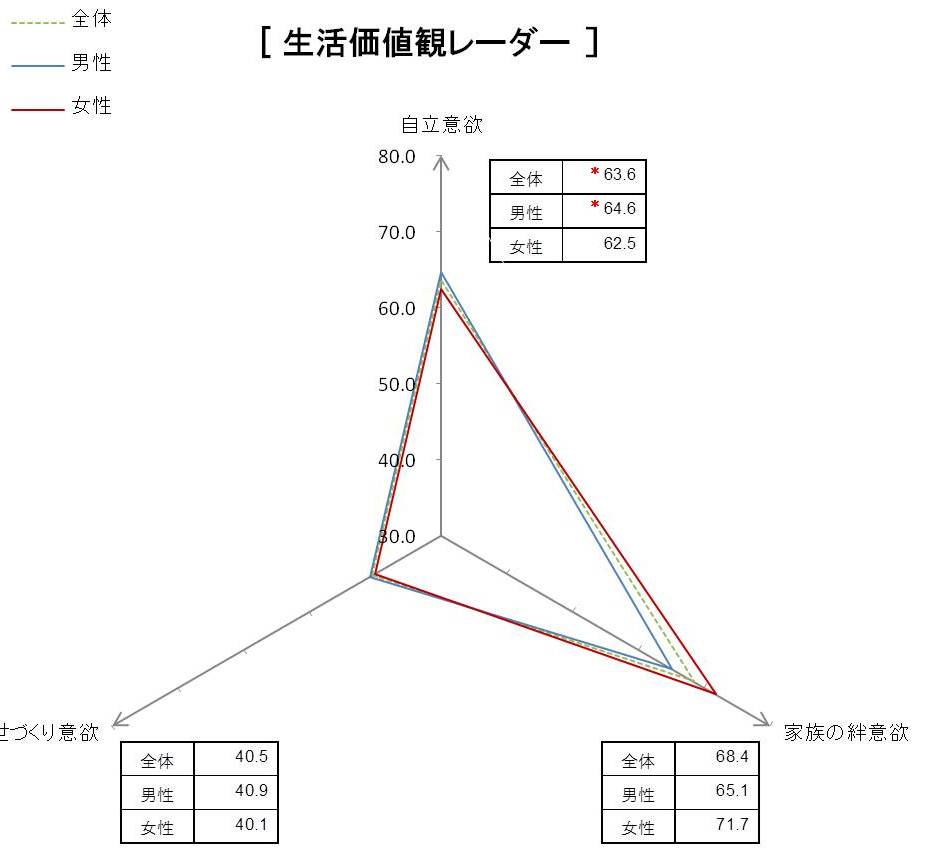 ●2013年春の[自立意欲 63.6点] [家族の絆意欲 68.4点] [世づくり意欲 40.5点]