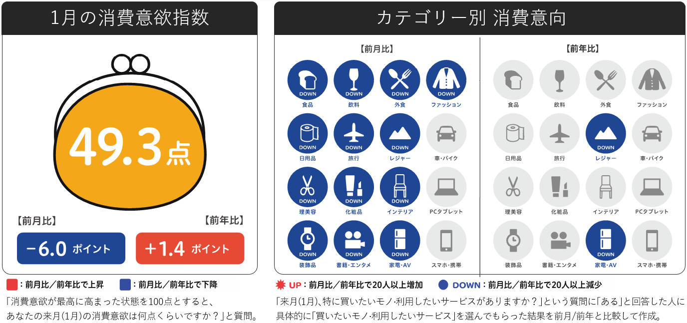2024年1月の消費意欲指数は49.3点。前月比で-6.0ptと大幅に低下、前年比では+1.4ptと上昇しました。