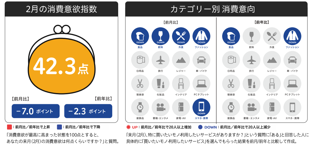 2024年2月の消費意欲指数は42.3点。前月比は-7.0ptと大幅に低下し、前年比では-2.3ptの低下となりました。