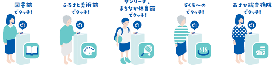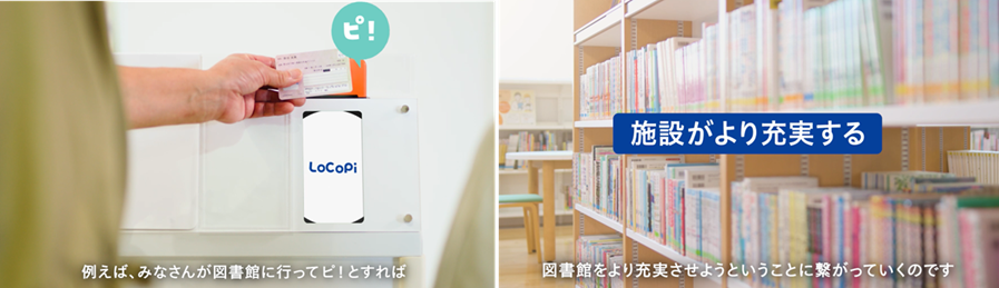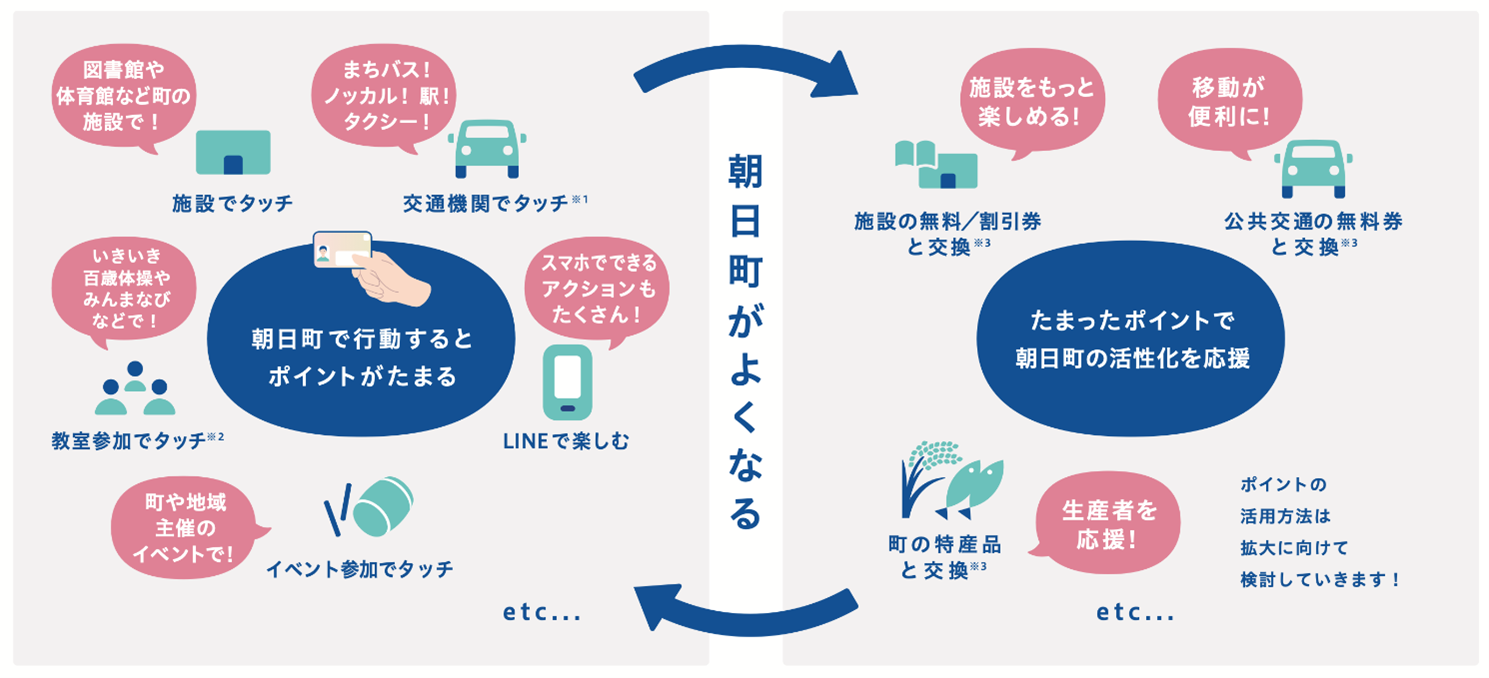 「LoCoPiポイント」は、LoCoPiあさひまちを使って行動することでたまるポイントです。図書館や体育館などの公共施設や、タクシーや「ノッカルあさひまち」、バスなどの交通機関、地域活性イベント参加など朝日町内で様々な行動をする際、マイナンバーカードを専用カードリーダーにタッチすることでポイントをためることができます。ポイントは、町の地産地消の特産品や公共交通が利用できる「LoCoPi交通チケット」、町内施設での決済に使える「LoCoPiデジタル商品券(電子マネー)」などに交換できます。朝日町で行動してたまったポイントが町内の移動促進・域内経済の循環につながることで、町がよりよくなる好循環を生み出す仕組みです。