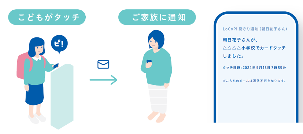 小中学校の登下校時や高齢者が参加する介護予防教室等のおでかけ先でマイナンバーカードを専用カードリーダーにタッチすると、メール通知が自動で見守りサービスを利用する保護者や家族などに届きます。なお、子ども向けには専用ICカードを発行し、持ち歩きの安心感を担保します。