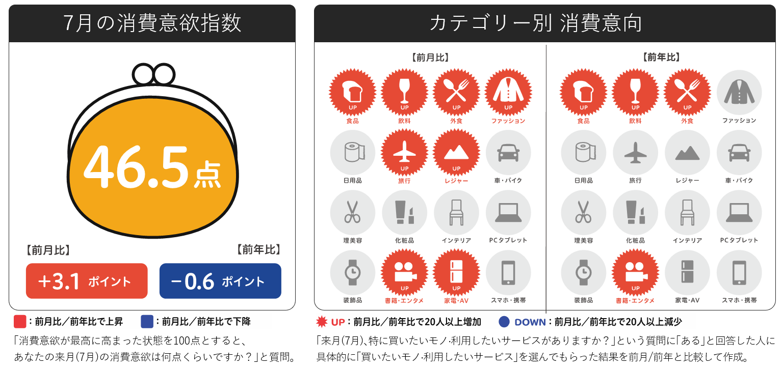 2024年7月の消費意欲指数は46.5点。前月比で+3.1ptと大幅に上昇し、前年比では-0.6ptで横ばいとなりました。