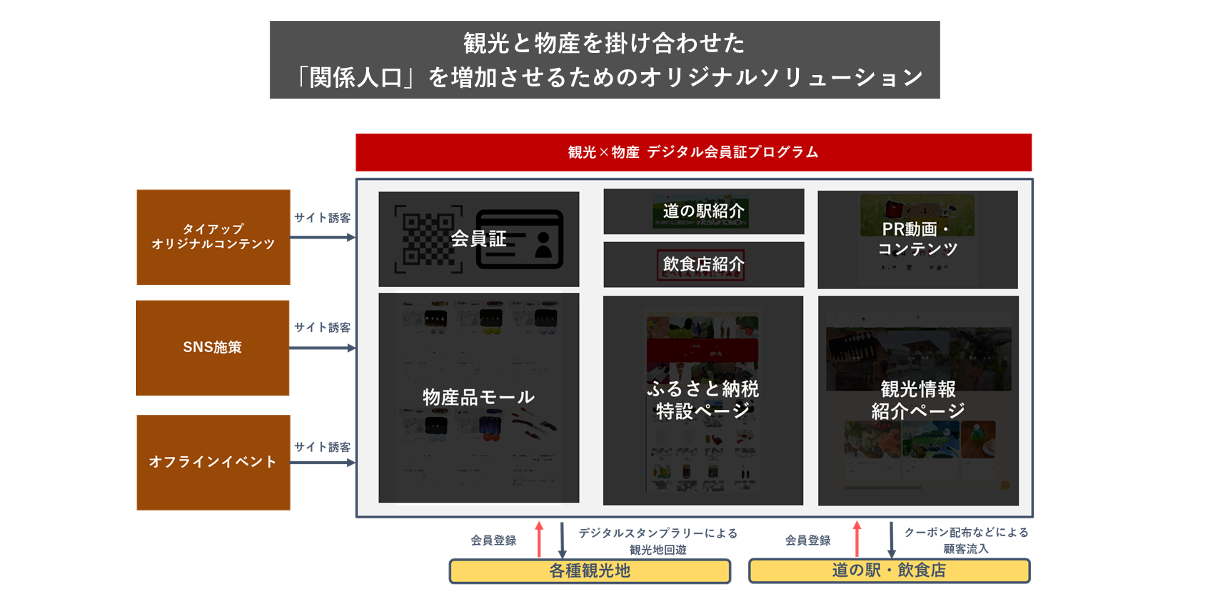 このような背景から「観光DXソリューション」では、観光誘客だけでなく、“観光×物産”の取り組みにより、「交流人口」の「関係人口」への変容を促すための支援を行います。