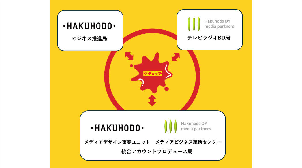 ケチャップは、今までの枠にとらわれない発想を実現させるため、「事業」「メディア」「IP」などの価値化やビジネス化を目指す博報堂および博報堂DYメディアパートナーズの組織と連携しながら、生活者価値をデザインする力とメディア・コンテンツ領域を掛け合わせ、生活者や社会を動かす開発を行います。