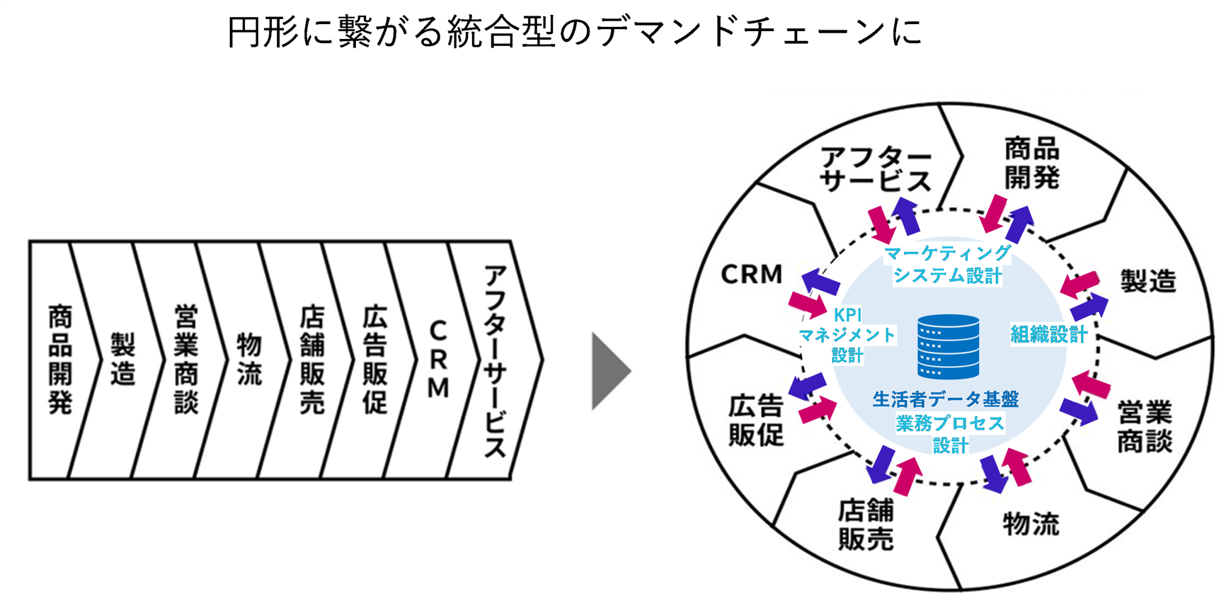 企業のサプライチェーン最適化のニーズは、DX(デジタル・トランスフォーメーション)の浸透により一巡し、成熟期を迎えています。こうした中、今後の重要な争点となるのが、生活者接点から生成される様々なデータを活用し、企業活動のあらゆるシーンで機動的な意思決定を実現する「デマンドチェーン変革」です。