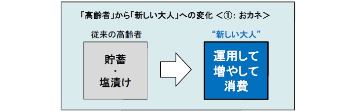 従来、高齢者といえば「貯蓄=塩漬け=消費しない」というのが、一般的なイメージでした。それが1400兆円と言われる日本の個人資産を生んだとも言えるのですが、団塊世代からは「おカネを増やして消費するエルダー」へと変化していることがわかりました。その原資はフロー(給与)でなくストック(退職金など)であるため、給与の増減に影響されることなく、景気を下支えします。