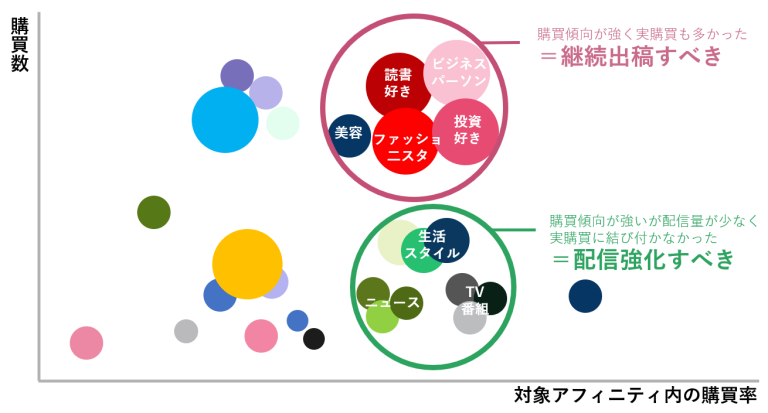 また、これまでは紐づけることが難しかったインターネット上の生活行動と購買行動を、各プラットフォーマーのデータクリーンルームでセキュアに分析することで、実購買層のデモグラ/興味関心/購買履歴といったユーザー特性の分析を行うことが可能となります。楽天の持つ興味関心セグメントごとの購買ポテンシャルを確認することができるため、購買に繋がりやすいセグメントを明らかにし、次回の配信に活用するなど、購買起点でのプラニングを実現できます(図2)。