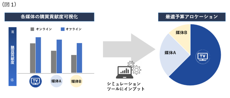 今回、第二弾としてTele-Digi AaaS for Purchaseでは新たに楽天のデータと連携した機能をリリースします。本機能では、インターネット・ショッピングモール「楽天市場」における消費行動分析データや、オフライン購買データなど、オンライン/オフラインにまたがる楽天の各種データをAaaSのデータ基盤として活用することで、広告接触ユーザーと非接触ユーザーの購買リフトを施策の前後で比較し、広告の効果を検証することができます。さらに、各メディアの購買リフトデータを博報堂オリジナルシミュレーションツールと連携させることで、購買をKPIとする各メディア予算配分の最適化を実現します(図1)。