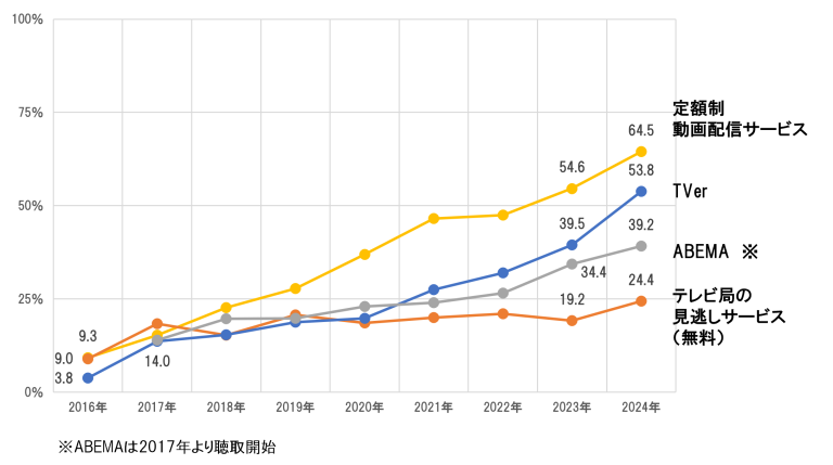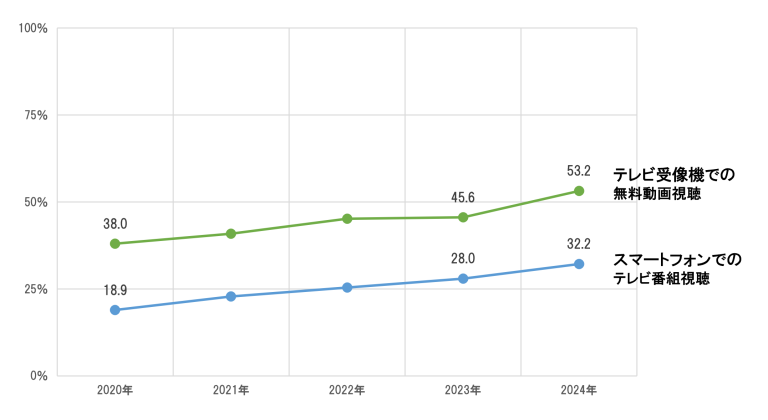 スマートフォンでのテレビ番組視聴が3割台に増加。また、テレビ受像機での無料動画視聴も過半数を超えた。テレビ番組をテレビ以外のデバイスで見たり、ネットの無料動画をテレビ受像機で見るなど、コンテンツ×視聴デバイスの組み合わせの多様化が加速している。民放公式テレビポータルTVerの利用率(53.8% 同14.3ポイント増)や、テレビ受像機のインターネット接続率(63.5% 同8.6ポイント増)の伸びも、多様化を加速する大きな要因となっている。
