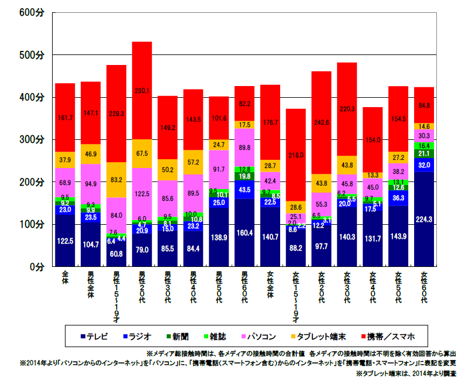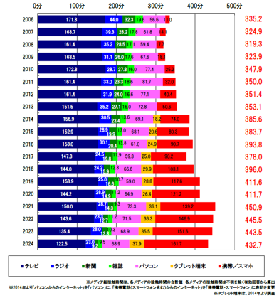 ①メディア総接触時間は432.7分。「携帯電話/スマートフォン」のシェアが前年比約3%増、「テレビ」が約2%減。