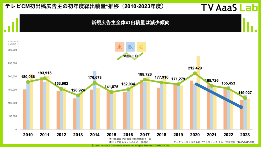 株式会社博報堂DYメディアパートナーズ(本社:東京都港区、代表取締役社長:矢嶋弘毅)の研究開発コミュニティ「TV AaaS Lab(テレビアースラボ)」はこの度、「テレビCM初出稿広告主分析2010-2024」を実施しました。関東・関西・名古屋いずれかのエリアでテレビCMに初出稿を行った企業の過去14年間分のデータを分析した結果から、主なファインディングスをご紹介します。