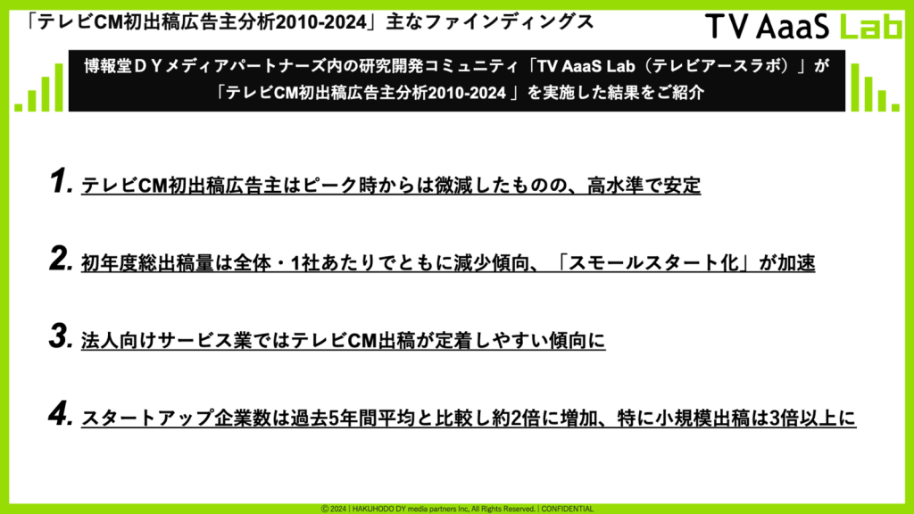 TV AaaS Lab研究レポート「テレビCM初出稿広告主分析2010-2024」