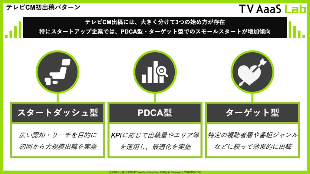 テレビCM出稿には、大きく分けて3つの始め方が存在。初回から大規模な出稿を行う「スタートダッシュ型」、エリアや出稿量を運用して最適化する「PDCA型」、そして視聴者層や番組ジャンルを絞って出稿する「ターゲット型」に分類される。今回の分析では、テレビCM初出稿広告主全体での出稿量と、一社あたりの平均出稿量の減少が見られ、スモールスタート化の傾向を確認できた。特に、スタートアップ企業では6割以上の企業が小規模出稿していることも明らかとなりPDCA型やターゲット型での出稿が増加していることも推察できる。