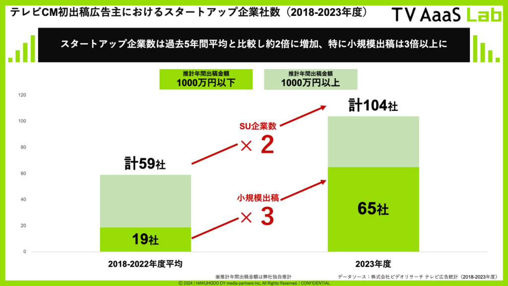 テレビCM初出稿広告主におけるスタートアップ企業数は2023年度と過去5年間の平均を比較して約2倍に増加。