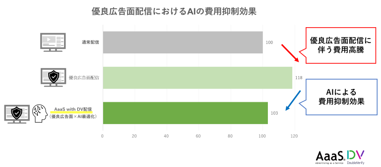 通常配信と比較し、優良広告面配信を行うとその配信費用(CPM)が平均して1.18倍(1.10~1.30)になります。一方、AaaS with DV配信では、AIによる配信ペースやタイミングの最適化を行うことで、優良広告面配信に伴う費用上昇を平均1.03倍(0.98~1.07)に抑えることが出来ました。