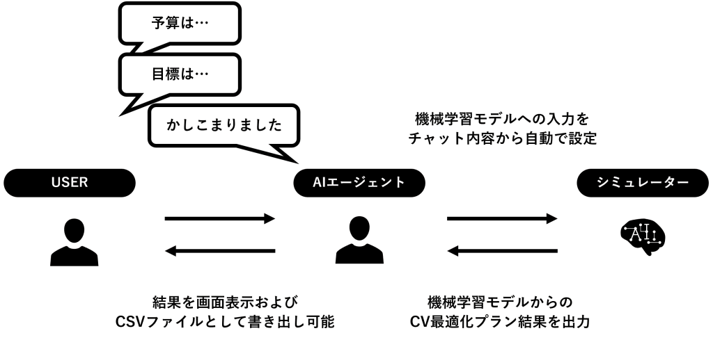 AIエージェントとのチャット形式の対話によるデジタル広告CVのシミュレーションが可能です。あわせて従来のシミュレーター同様に選択項目や数値入力を組み合わせたシミュレーションも可能です。