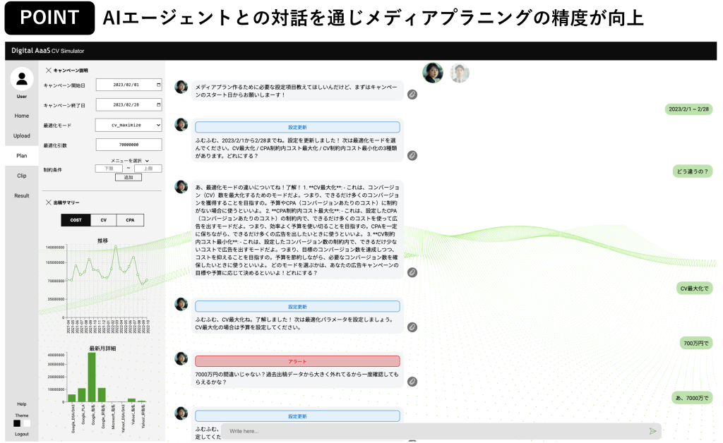 ユーザーは「過去出稿に基づいて着実なプランを提案する」「新規メニューを積極的に提案する」など複数の特性から目的に合ったエージェントを選ぶことができます。AIエージェントとの対話により、各媒体の予算や出稿期間などを決めることができ、また、予算や媒体条件の入力において、誤りやこれまでと大きく異なる傾向があった際にアラートを受け取ることができます。
