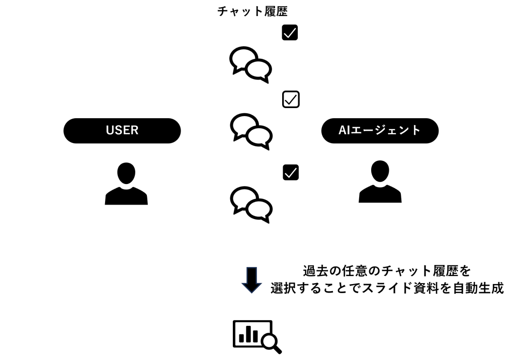 ユーザーは、AIエージェントから広告プランシミュレーションにおける不明点やシミュレーション結果の説明を受けることができ、任意の返答をクリップ機能で保存することが可能です。また、任意のチャット履歴を複数選択することでスライド形式の資料を自動作成することが可能です。
