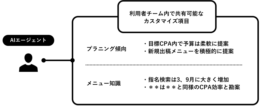 ユーザーは、メディアに関する新たな知識やプラニング特性などを「dialog」という機能を通してAIエージェントにインプットできます。これによりAIエージェントが持つデフォルトの知識や特性だけではなく、個別の事情に合わせてAIエージェントをチューニングすることが可能です。