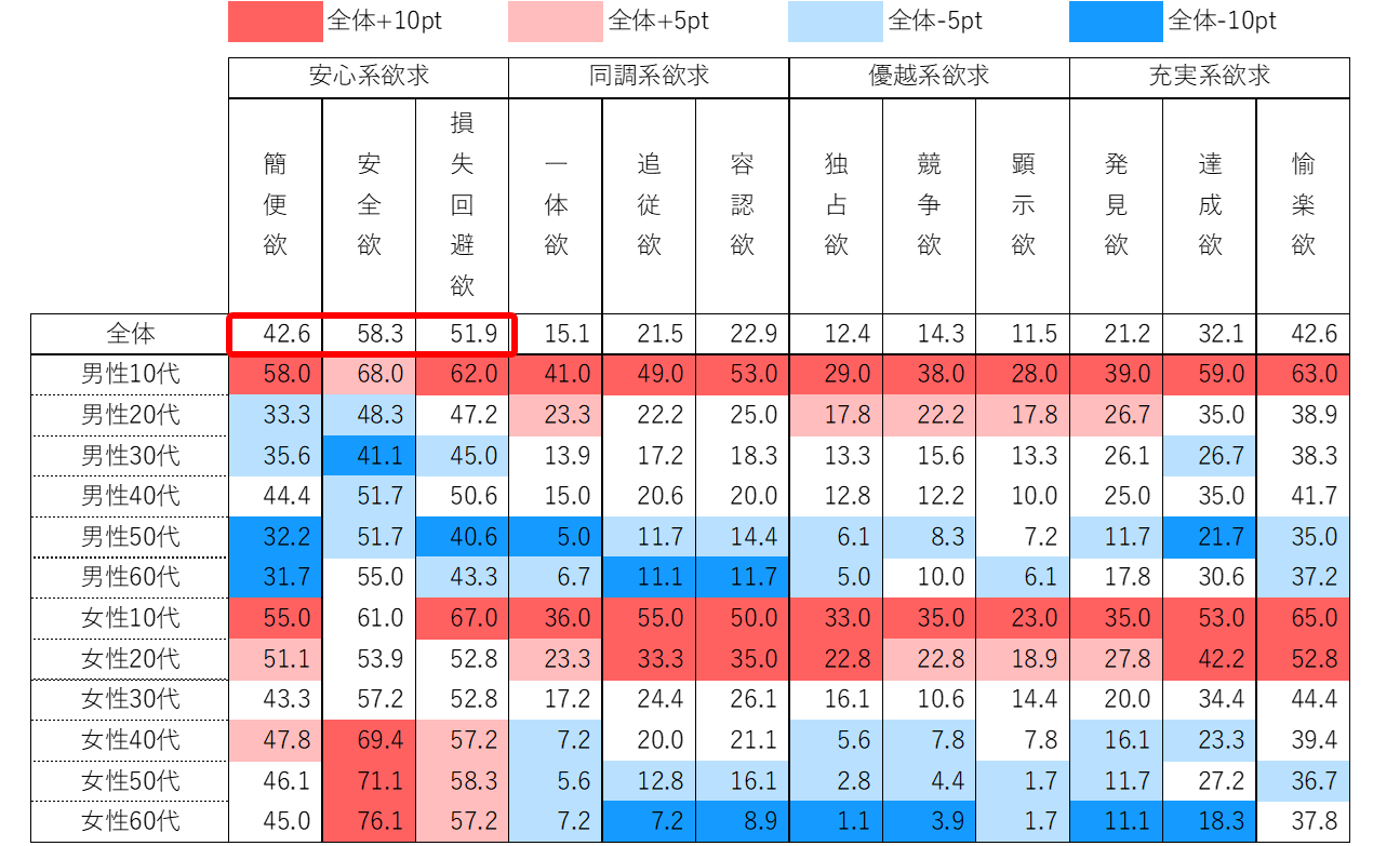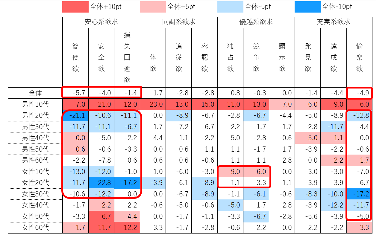 一方、女性10-20代では元々高い独占欲・競争欲が増加しており、若年層では自己実現につながる消費意欲が高まりつつある可能性もうかがえます。