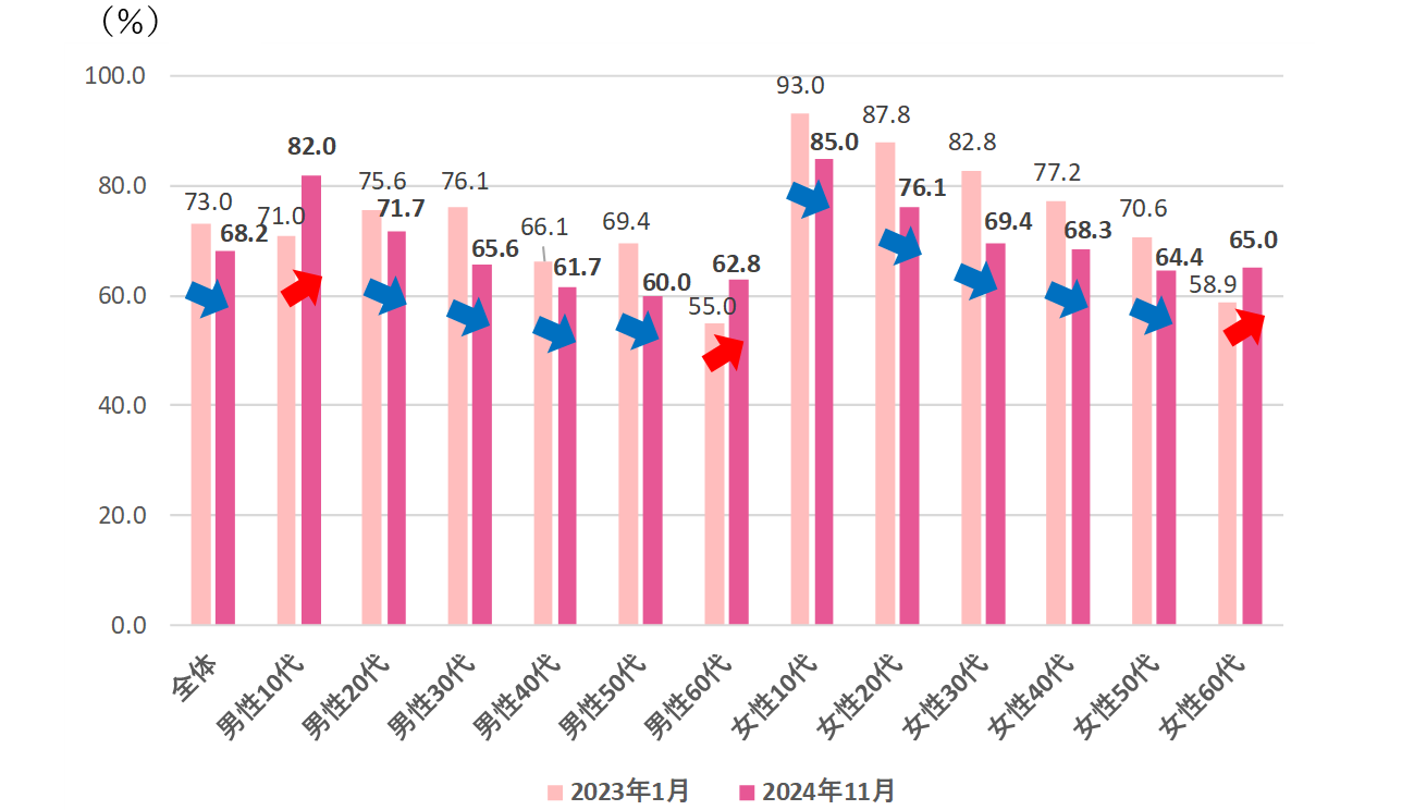 当研究所が定義した、情報プールや気持ちの発火の元となる「12欲求(参考資料4参照)」について、2024年調査の値とコロナ禍での調査(23年)との差を性年代別にみると、安全・損失回避・簡便を求める「安心系欲求」が23年同様TOP3となりましたが、値としては減少傾向にあります(特に男性20-30代・女性10-30代)。また、現役世代全体で愉楽欲は減少。楽しみたい気持ちにも落ち込みがみられます。