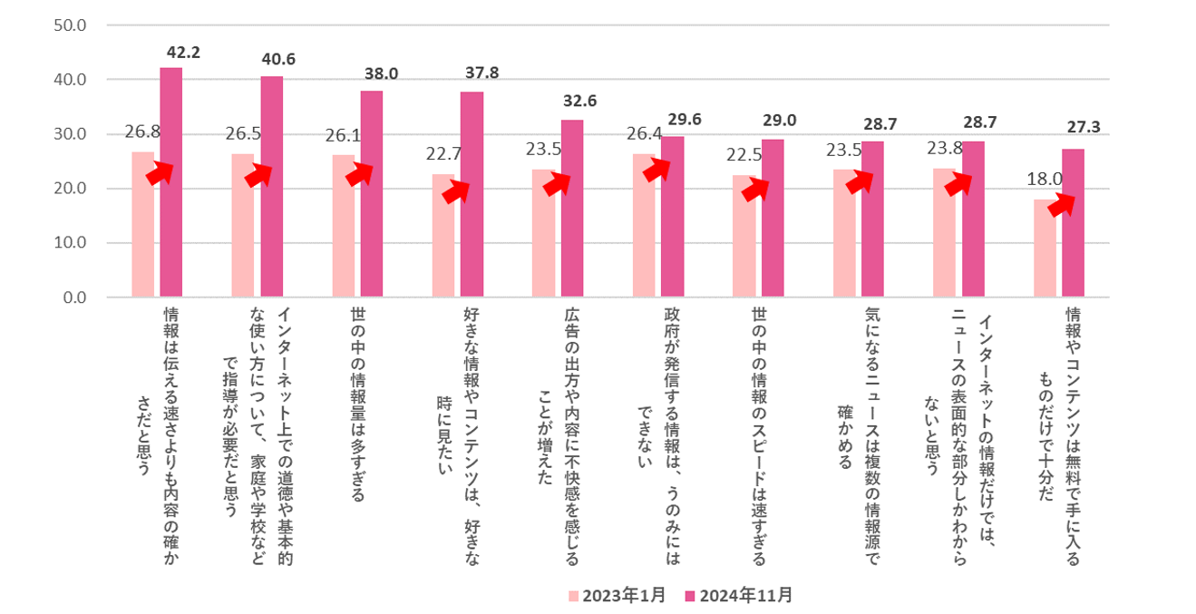 「情報は伝える速さよりも内容の確かさ」「世の中の情報量は多すぎる」といった情報量や情報の真偽・扱い方への不安のほか、「インターネット上での道徳や基本的な使い方について、指導が必要」「気になるニュースは複数の情報源で確かめる」など、情報を受け身で引き寄せるだけでなく、引き寄せた情報を主体的に吟味する姿勢が強まっていることがうかがえます。