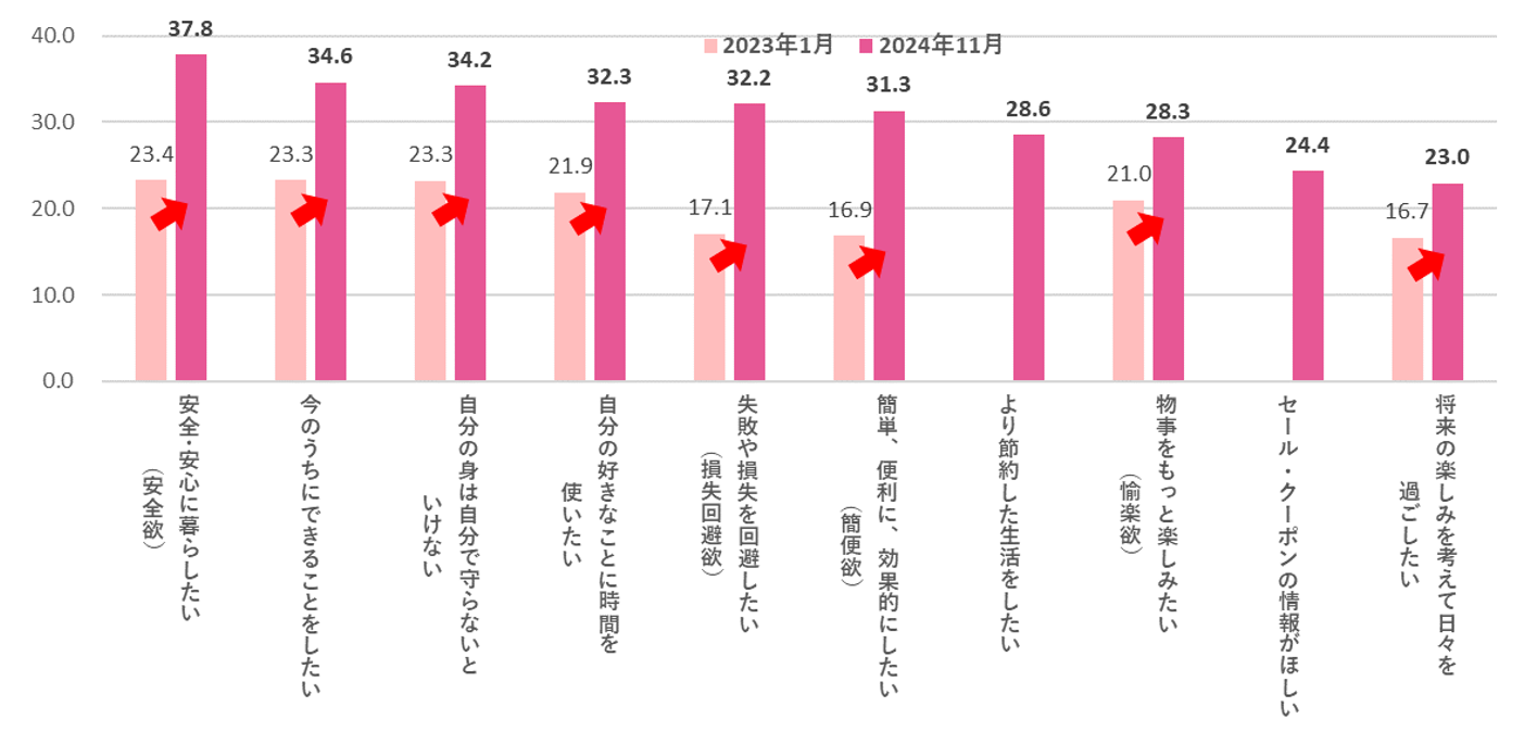 「安全・安心に暮らしたい(安全欲)」「今のうちにできることをしたい」「自分の身は自分で守らないといけない」がTOP3で、23年からも増加。「失敗や損失を避けたい(損失回避欲)」「より節約した生活をしたい」も高く、物価高や海外情勢・戦争などの情勢不安により、新たな不安の高まりが予想されます。