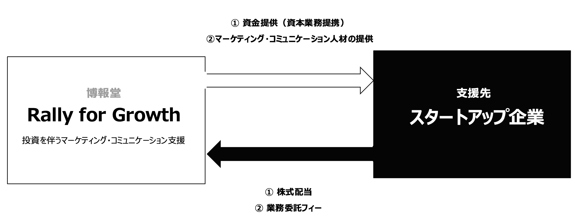 博報堂の持つ4つの強みを中心に、ヒト・モノ・カネ・情報などのアセットを活用し、パートナー企業の皆様と「共に稼ぐ」を前提に、早期に成長サイクルを軌道にのせていきます。