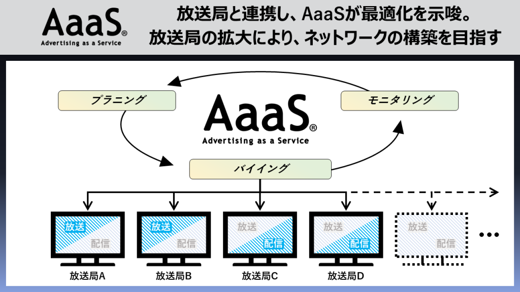 AaaSは、広告主のKPI達成に向け、地上波テレビ広告枠とコネクテッドTV広告枠と連携し、リアルタイムに広告配信を統合的にオペレーションするネットワークの構築を目指しています。AaaSが最適なオペレーションを実施し、複数の放送局を横断したバイイングを行うことで、広告枠の運用と露出を最適化します。例えば、日本テレビ放送網とは放送局のプラットフォームとAPIを通じて連携しており(※3)、TBSテレビ、フジテレビジョン、テレビ朝日、テレビ東京などとはTele-Digi AaaSを活用したオンライン連携を推進しています。連携する放送局の広がりに伴いネットワークを拡大し、横断的なオペレーション精度を高め、より高度な運用型テレビ広告を実現することで、広告効果の最大化と運用効率の向上を推進します。