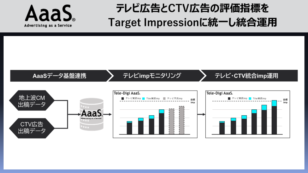 本メニューでは、Tele-Digi AaaSを活用して、地上波テレビ広告の各ターゲット視聴率を「Target Impression」に換算し、放送局が保有するTVerのコネクテッドTV広告枠と指標を統一した運用を実現します。また、Tele-Digi AaaSで地上波テレビ広告とコネクテッドTV広告の実績を常時モニタリングし、統合管理することで、キャンペーン期間中の露出目標を確実に達成することが可能な広告運用を目指します。